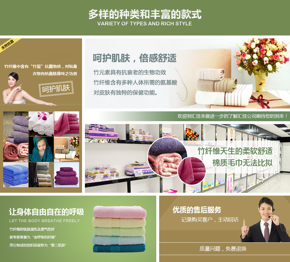 德州匯佳紡織品有限公司專業(yè)生產(chǎn)竹纖維毛巾,是竹纖維毛巾品牌廠家,并且提供竹纖維毛巾禮盒套裝用于福利和禮品。公司座落于山東德州,交通十分便利,公司近臨京滬高速公路,距離德州火車站、汽車站10公里京滬高鐵5公里,濟(jì)南國際機(jī)場(chǎng)120公里。
